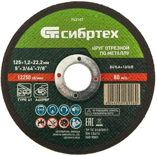 Отрезной круг по металлу Сибртех 743147, 125 х 1,2 х 22,2 мм, используется в качестве оснастки на УШМ для сухого реза изделий из углеродистых сталей: труб, арматуры, проволоки и т.д. Высокая производительность позволяет использовать круг как в быту, так и в частной мастерской или на небольших производства