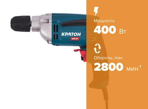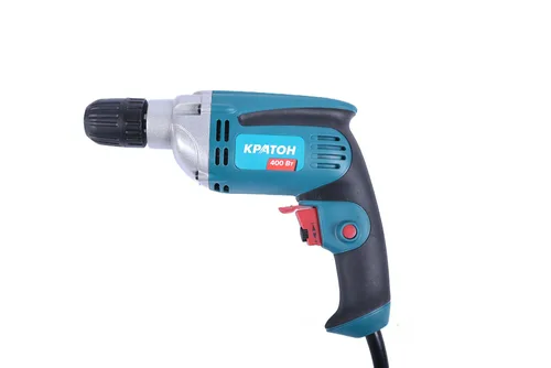 Дрель Кратон D-400/10P с номинальной мощностью 400 Вт весит всего 1570 г. Небольшой вес устройства позволяет выполнять работы на протяжении длительного времени. Инструмент создан для помощи в ремонтных и строительных работах. Мощность дрели обеспечивает вращение шпинделя с частотой до 2800 оборотов в минуту. Резьба шпинделя 3/8”, что определяет рабочий размер патрона для сверла в диапазоне от 0 до 10 мм. Диаметр получаемого отверстия зависит от просверливаемого материала: