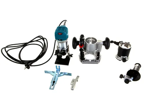 Фрезер; Параллельный упор; Патрубок для пылесоса; Цанга 6 мм; Цанга 8 мм; Ключ; Дополнительные основания - 3 шт.; Дополнительная рукоятка; Направляющая; Сумка