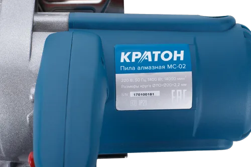 Пила по камню Кратон MC-02 мощностью 1400 Вт предназначена для резки твердых материалов, таких как кирпичная кладка, бетон, плитка. За счет подвижной части конструкции может работать с материалом под фиксированным углом наклона. Подключение воды в зону реза значительно продлевает срок службы оснастки. Простой доступ к щеткам позволяет заменять расходник самостоятельно. Ручной электроинструмент удобен для долговременной работы, мягкая резиновая накладка рукоятки обеспечивает надежный хват.
