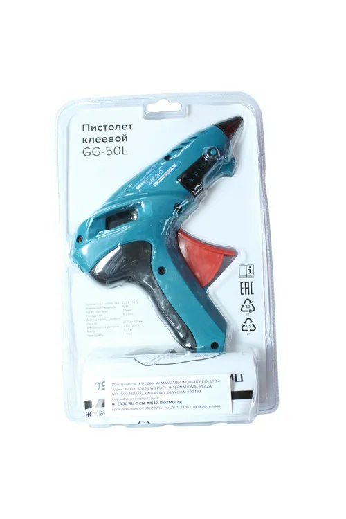 "• Пистолет клеевой 1 шт.; • Кабель электропитания с вилкой 1 шт.; • Подставка 1 шт.; • Стержень клеевой 2 шт.; • Сопло 2 шт.; • Коробка 1 шт.; • Инструкция по эксплуатации 1 экз."