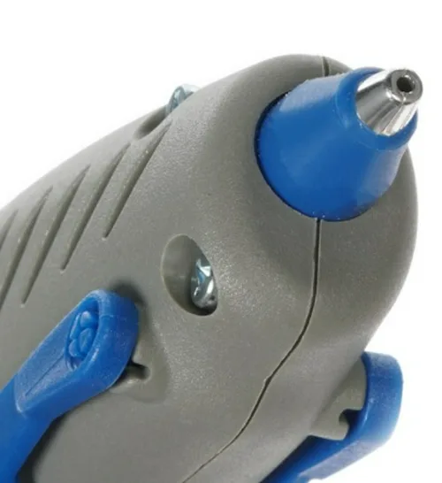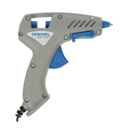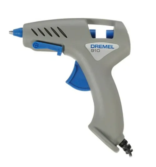 Dremel 910 представляет собой высокотемпературный клеевой пистолет (165 °C) с наконечником, защищенным от подтекания. Благодаря компактному размеру и превосходной эргономике (T-образная рукоятка, устойчивая база, выдвижная подставка), это идеальный инструмент для несложных домашних проектов, например склеивания керамики, дерева, пластика, стекла и т. д. Подходит для клеевых стержней 7 мм