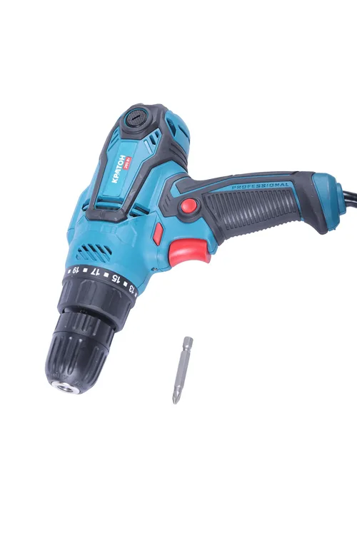 Пистолетная дрель-шуруповерт Kraton ESDD-280/24 с питанием от сети предназначена как для заворачивания шурупов, так и для сверления отверстий. Для несложной и оперативной смены насадок инструмент оборудован патроном с быстрозажимным способом крепления насадок. Прорезиненные накладки препятствуют скольжению прибора во время работы. Функция реверс удобна для освобождения застрявшего сверла и отворачивания шурупов. Клавиша «пуск» может долговременное фиксироваться в нужном положении. Дрель имеет 24 уровня регулировки крутящего момента.