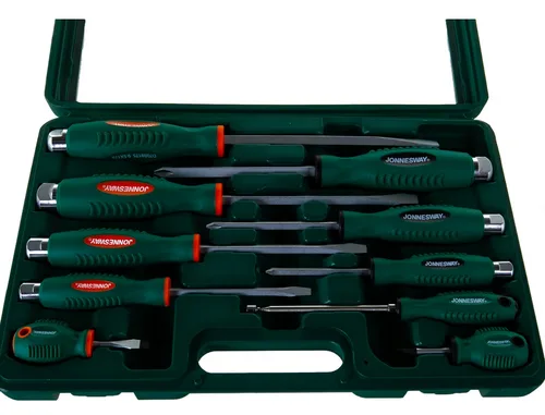 Набор ударных отверток Jonnesway D70PP10S используется для закручивания и выкручивания различных крепежей. Инструмент лежит в кейсе для удобной транспортировки.