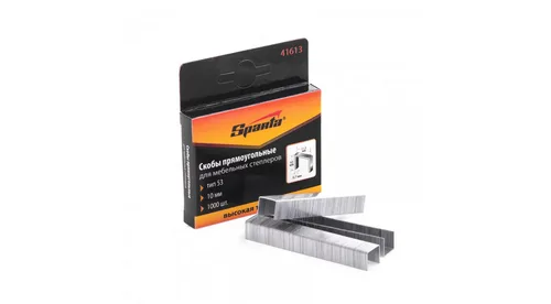 П-образные скобы Sparta 41613 типа 53, размером 10 х 11,3 х 0,7 мм, 1000 шт. в упаковке, заправляются в мебельные степлеры.