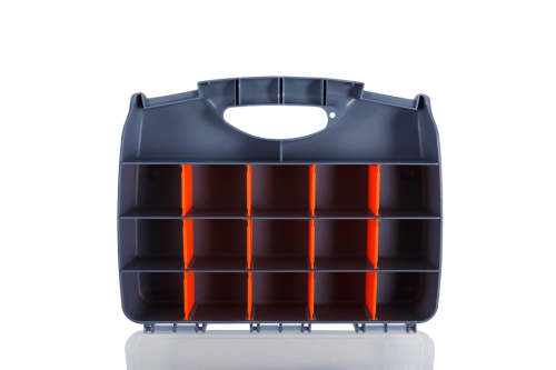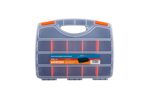 Ящик-органайзер пластиковый фирмы Кратон 320 мм имеет по 15 ячеек с каждой из сторон ящика. Оснащен удобной ручкой для транспортировки. Внутреннее пространство разделено на секции для хранения мелочей, имеются большие отделения для ручного инструмента. Изготовлен из высокопрочного пластика, который не раскалывается при ударе, выдерживает перепады температурных режимов. Фиксаторы в количестве 2 штук надежно удерживают крышку.