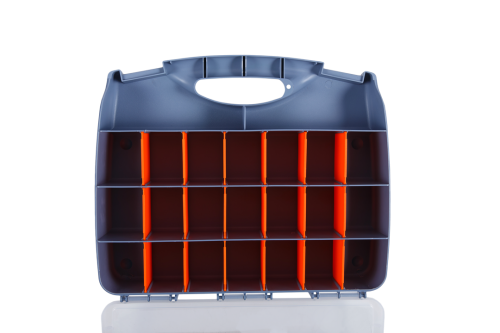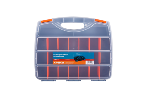 Ящик-органайзер пластиковый представленный брендом Кратон длиной 380 мм состоит из 18 ячеек с одной стороны и такого же количества с другой стороны ящика. Внутри имеются разделения на секции для хранения мелочей, небольшие отделения для ручного инструмента. Оснащен ящик удобной ручкой для транспортировки. Изготовлен из пластика, который не трескается при ударе, выдерживает перепады температуры. Фиксаторы в количестве 2 штук надежно удерживают крышку. Они легко и быстро открываются без применения силы. Комфортность при транспортировке и хранении благодаря компактности.