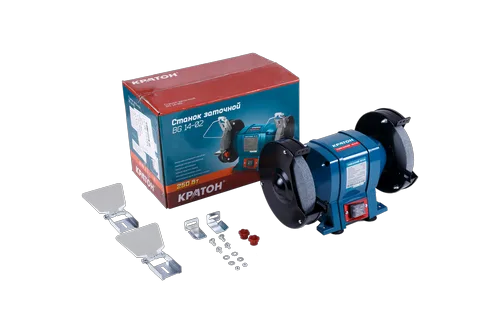 Заточной станок бренда Кратон BG 14-02 идеально подходит для выполнения домашних работ. Компактный размер позволяет разместить его в любом удобном месте в мастерской. Устройство эффективно справляется с удалением ржавчины, заточкой и шлифовкой, выравниванием кухонных ножей, сверл, ножниц, стамесок. Станок оборудован термоэлектрическим предохранителем для защиты от критического перегрева. Наличие двух токарных станков с разной плотностью зернистости делает его универсальным в использовании.