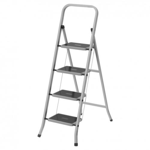 - Прочная конструкция — стремянка изготовлена из стального профиля и снабжена надежным механизмом раскладывания, поэтому выдерживает нагрузку до 150 кг.