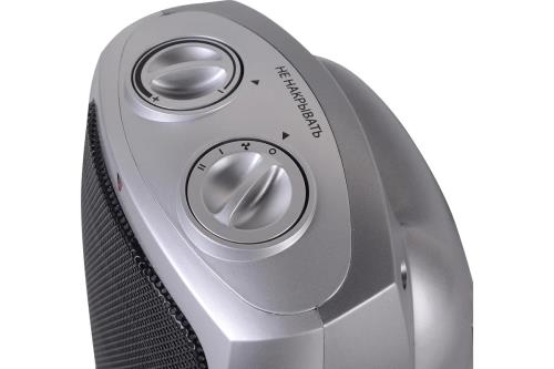 Прибор оснащен вентилятором, который принудительно нагнетает воздух, заставляя его проходить через нагревательный элемент, а затем моментально распределяет теплые потоки по всему помещению. Модель работает в 3 основных режимах: на средней и высокой мощности, а также без нагрева для вентилирования помещения. Выбор режима и установка нужной температуры производится путем вращения регуляторов, расположенных сверху корпуса.