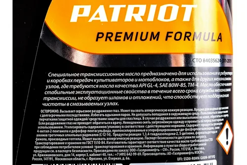 Масло трансмиссионное G-Motion Gear 80W-85, 1 л PATRIOT 850030500 обеспечивает смазку механизмов и узлов в редукторе и коробке передач культиваторов и мотоблоков. Обладает высокими антикоррозионными и антиокислительными свойствами. Не образует шламов и отложений, что способствует поддержанию чистоты в смазываемых узлах.