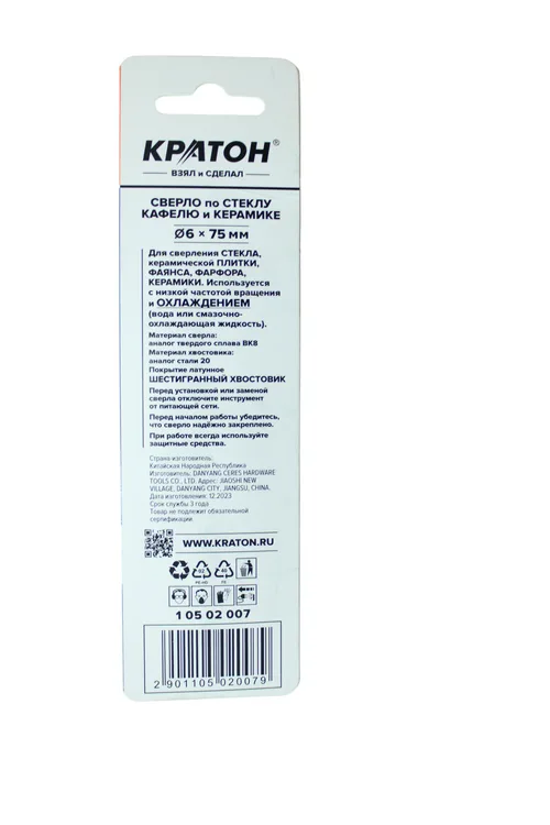Сверло по стеклу и кафелю Кратон, шестигранный хвостовик d6 х 75 мм