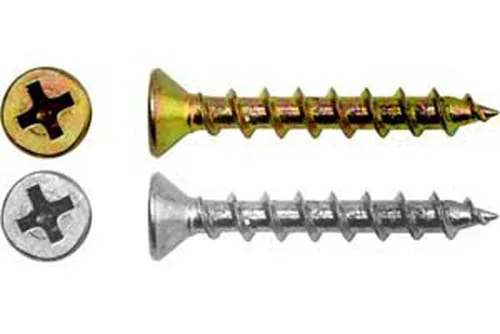 Шуруп универсальный потай головка – крепежный элемент, с острым наконечником, потайной шляпкой с крестообразным шлицем. Шуруп универсальный желтый применяется для соединения деревянных элементов, гипсокартонных плит, тонкого листового металла и других материалов; для сквозного монтажа конструкций к деревянным основаниям, а также с помощью дюбелей шурупы универсальные используются для монтажа в пустотелые и полнотелые основания.