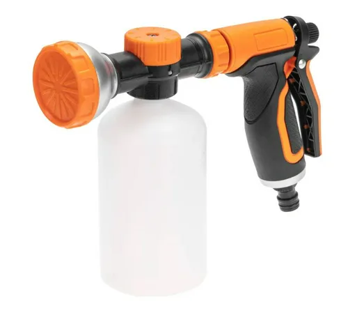 Пистолет-распылитель с резервуаром позволит полить растения с добавлением удобрений или же помыть что-то с моющим средством. Благодаря специальной емкости не требуется предварительное смешивание.