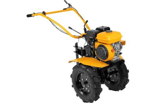 - Эффективная работа — благодаря усиленному шестеренчато-цепному редуктору с чугунным корпусом мотоблок успешно справляется даже с плотным, глинистым грунтом