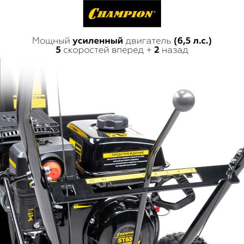 Снегоуборщик CHAMPION ST656 предназначен для расчистки небольших территорий от снега, например, частных стоянок, парковок, подъездных дорожек. Оснащен 4-тактным одноцилиндровым двигателем Champion G200SHK мощностью 6.5 л.с. с воздушным охлаждением. Ширина захвата составляет 56 см. Благодаря двухступенчатой системе обработки, а также зазубренному шнеку агрегат легко справится с уборкой как свежевыпавшего, так и слежавшегося снега. Дальность выброса достигает 12 м.