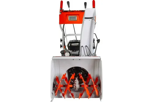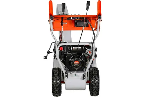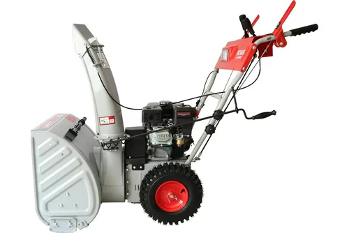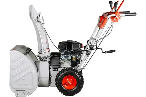 Снегоуборщик работает от 4-тактного двигателя мощностью 7 л. с. Используется воздушное охлаждение. Электростартер от сети 220 В позволяет без проблем запускать технику даже после длительного нахождения на морозе. Самоходный колесный агрегат оснащен фарой, что дает возможность расчищать территорию от снега даже в сумерках. Большие колеса с глубоким протектором обеспечивают хороший контакт с поверхностью.