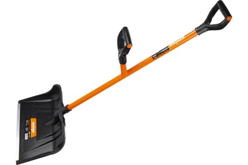 Лопата для уборки снега имеет прочный морозоустойчивый пластиковый ковш и металлический черенок с двумя D-ручками для удобного откидывания снега. Продуманная эргономика позволяет легко откидывать тяжелый снег.
