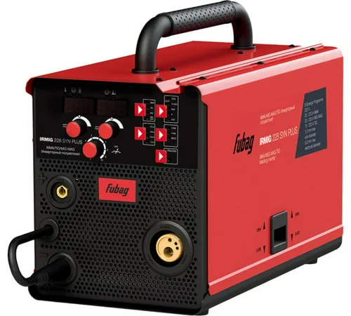 Инверторный полуавтомат предназначен для сварки методом MIG/MAG, TIG Lift, MMA. В режиме MIG/MAG аппарат имеет 8 синергетических программ для сплошной проволоки и для флюсовой проволоки в режиме без синергетики. Выбор программ осуществляется с интуитивно понятной панели управления. Панель управления имеет 2 цифровых дисплея для отображения основных сварочных параметров. Для более точной настройки режимов сварки аппарат обладает возможностью осуществлять регулировку индуктивности. Дополнительно к синергетическим программам серия аппарата IRMIG 228 SYN имеет режим ручной настройки. Это позволяет сварщику индивидуально настроить аппарат под нестандартные задачи, для которых корректировка напряжения синергетических программ недостаточна. Бестоковая заправка проволоки и продувка газа реализована на панели управления при помощи нажатия центральных регуляторов.