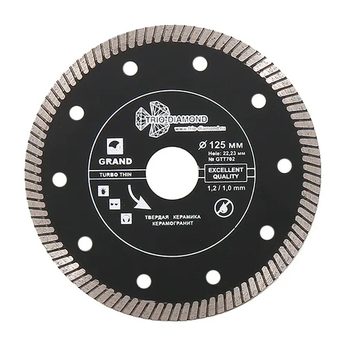 Диск алмазный Trio-Diamond Turbo Grand GTT702 ∅125 мм изготовлен из прочного сплава и очень тонкого слоя напыления в режущей части, толщиной всего 1,2 мм. С помощью болгарки или штробореза этим прочным кругом можно сделать рез до 20 мм не только по натуральному камню, но и армированному бетону. Он отличается: высочайшим качеством резки, эффективностью, износостойкостью, быстротой обработки, легкостью в эксплуатации. Алмазный диск по камню 125 мм можно использовать без воды. Имеющиеся отверстия способствуют дополнительному охлаждению и выбросу излишней пыли.
